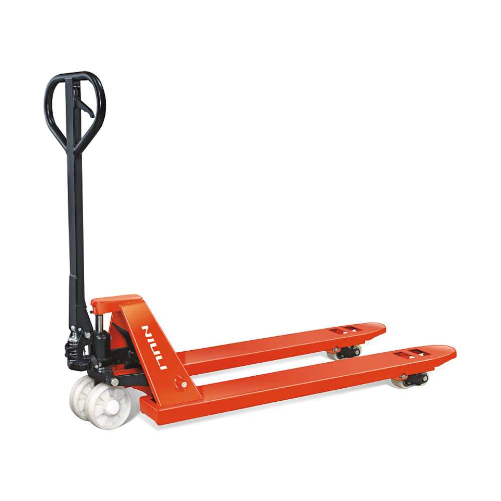Niuli CBY-JC2.0 — гідравлічний візок для переміщення вантажів на піддонах, спроектований спеціально для не інтенсивної роботи на невеликих складах, у магазинах, майстернях і невеликих виробництвах. Легка, але достатньо міцна зварна сталева конструкція шасі забезпечує балан міцності та зручності експлуатації. Вантажопідйомність 2000 кг підходить для стандартних європіддонів з легкими та середніми вантажами. Довжина вил 1150 мм дозволяє працювати з європалетами (1200×800 мм і 1200×1000 мм), ширина 550 мм забезпечує стабільність. Поліуретанові колеса та ролики не залишають слідів на підлозі, рухаються плавно та тихо. Стійке до механічних пошкоджень покриття захищає конструкцію від подряпин і корозії. Компактна вага 53 кг робить роклу зручною для ручного маневрування. Висота підйому регулюється від 75 до 185 мм. Техніка поставляється в одному з трьох кольорів: жовтому, помаранчевому або червоному.