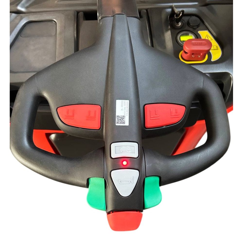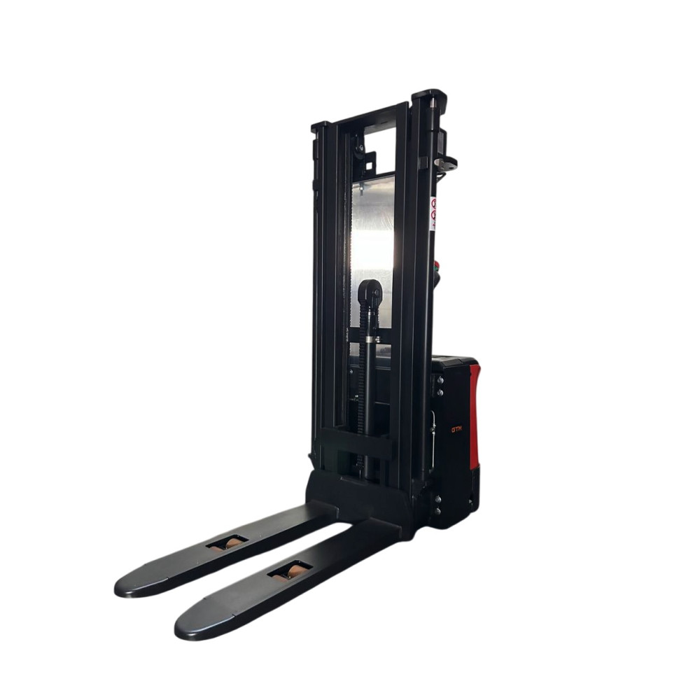 Система з двох незалежних електродвигунів оптимізована для роботи з важкими вантажами на великій висоті: потужний мотор 2,2 кВт керує підйомом, а 0,75 кВт відповідає за швидке та плавне переміщення. Швидкість руху з вантажем досягає 4 км/год, без вантажу – 4,4 км/год. Складана платформа для оператора забезпечує комфорт під час роботи та економить місце при зберіганні. Чавунні колеса з поліуретановим захистом (4 передні, 2 задні) витримують тривалі навантаження, а радіус розвороту 1481 мм забезпечує маневреність. Штабелер працює на поверхнях з нерівністю до 6°.
